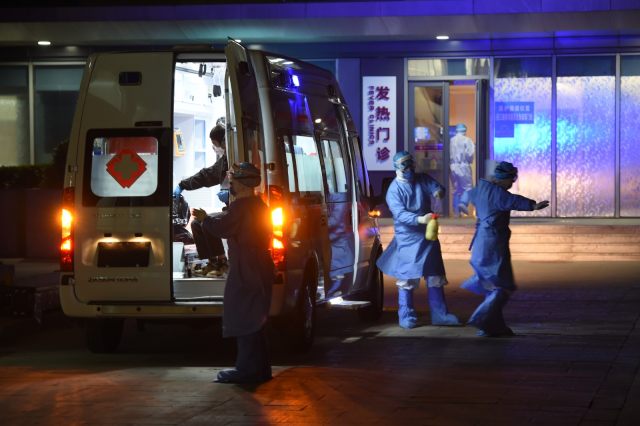 「夜战」——3 月 8 日,交接新冠肺炎疑似患者时转运人员进行消杀工作。