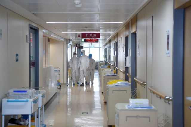 」漫步战道「——疫情来袭后,河南省人民医院迅速反应,于 1 月 24 日在院公共卫生医学中心内建立隔离区,图为接收患者前医务人员在隔离区病房走廊做最后的流程校对。