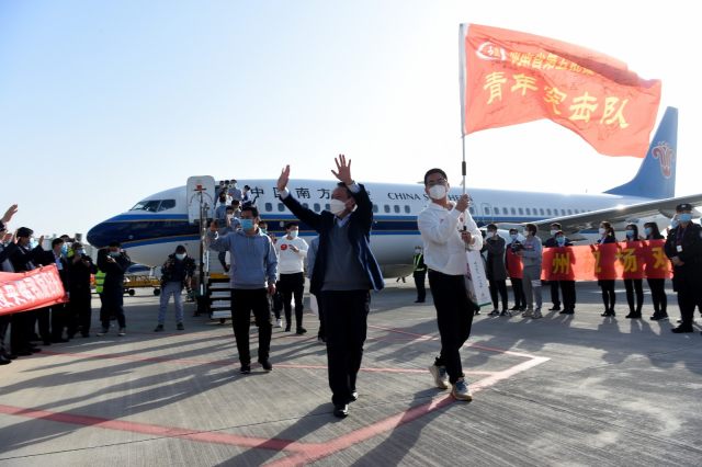 胜利凯旋!——3 月 19 日河南省第五批援鄂医疗队队长陈传亮和队员们走下飞机向人群招手。